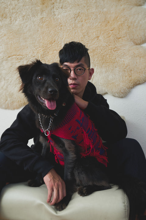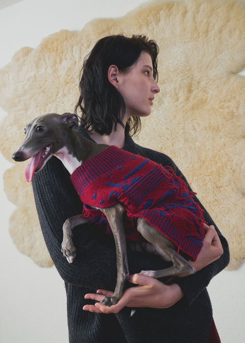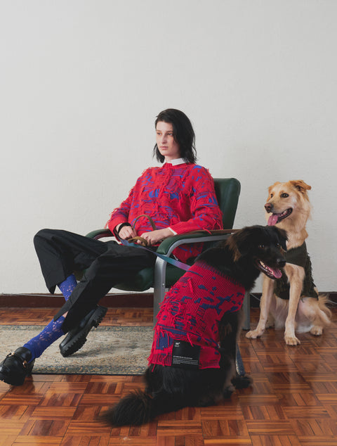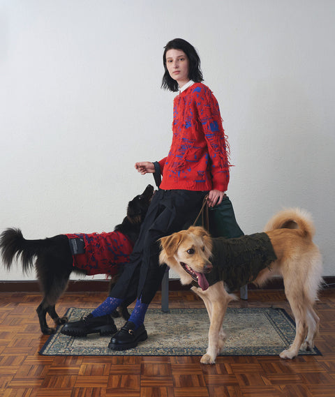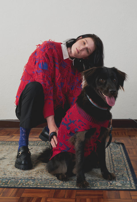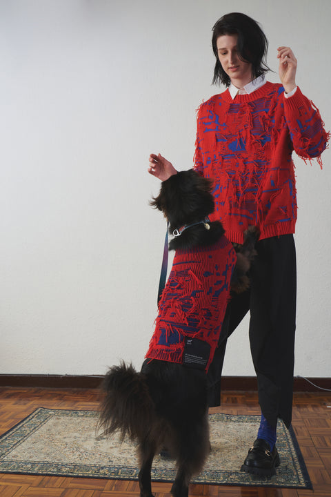 Ripped-style sweater vest with vibrant color contrast. For those who want to play cool and stand out during a walk in the snow.