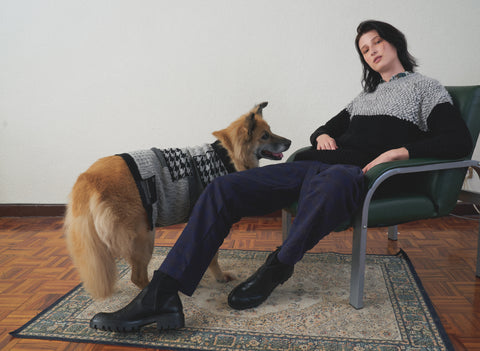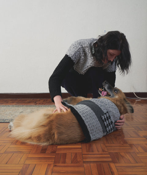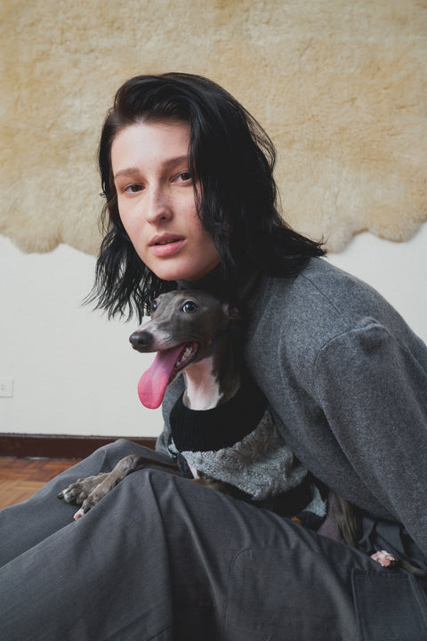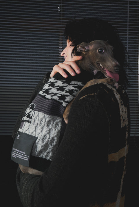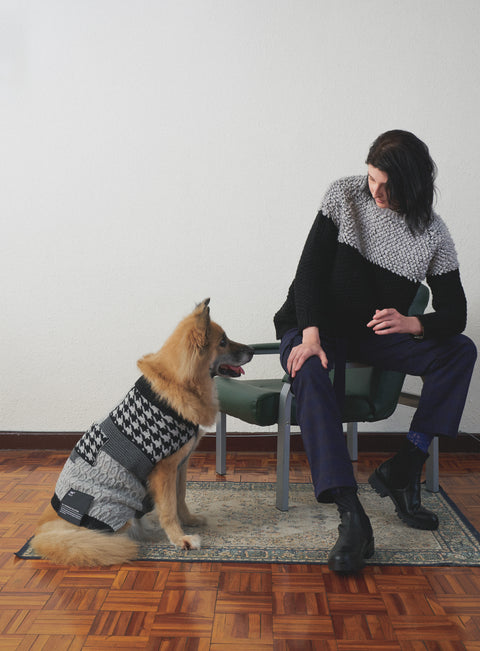 Patch sweater vest inspired by bird feathers. Various fabrics and weaves are mixed to create different shades of grey and at the same time bring an asymmetric yet harmonious effect.