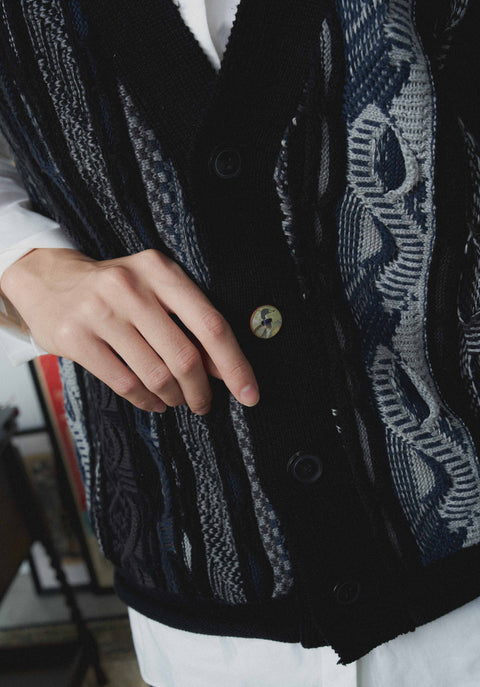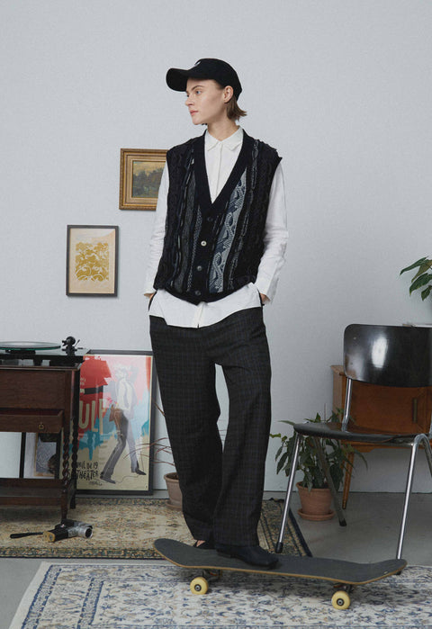 Within this collection, patchwork and dis- tressed elements are incorporated into the knitwear, showcasing various styles reminis- cent of denim workwear. It also features pat- terns and textures inspired by vintage sweat- ers, such as stripes and herringbone weaves, creating entirely distinct visual effects. These designs are characterized by eye-catching patchwork and multi-layered color variations, crafting an atmosphere that combines a neu- tral style with a sense of artistic conflict.