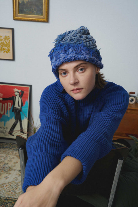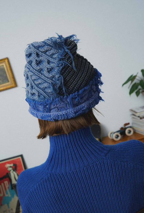 The "DENIM WASH" series seamlessly blends the art of knitting with the technique of stone-washing, resulting in a gradient effect that mimics the brushed and faded appear- ance of denim workwear. This series pays homage to the world of denim.