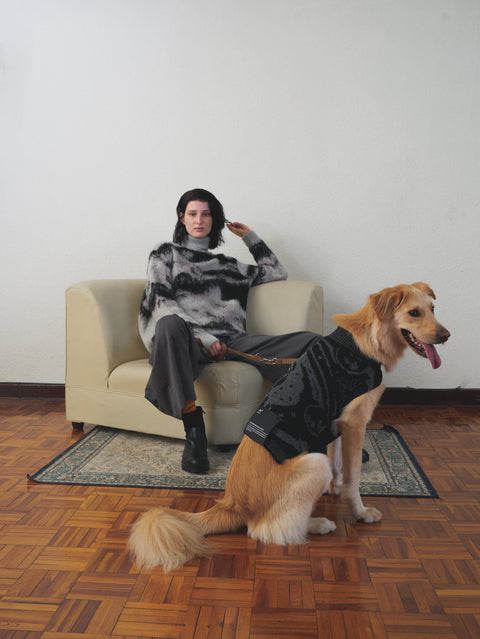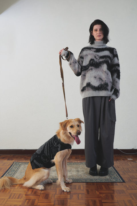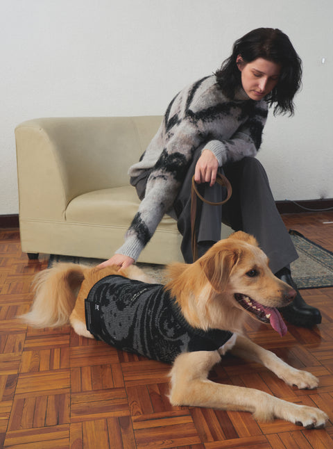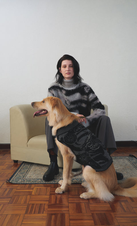 Jacquard sweater vest, featuring tiger stripes hand-knitted with satin stitch.